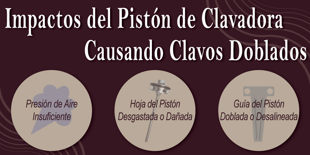 Un pistón de clavadora que está desgastado, astillado o mal alineado puede generar golpes irregulares, causando que los clavos se doblen en lugar de introducirse rectos en el material.